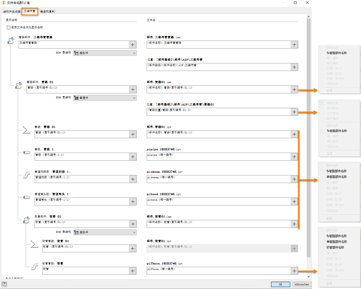 手动定义管路部件文件名时,使用子零部件的新属性继承文件名。