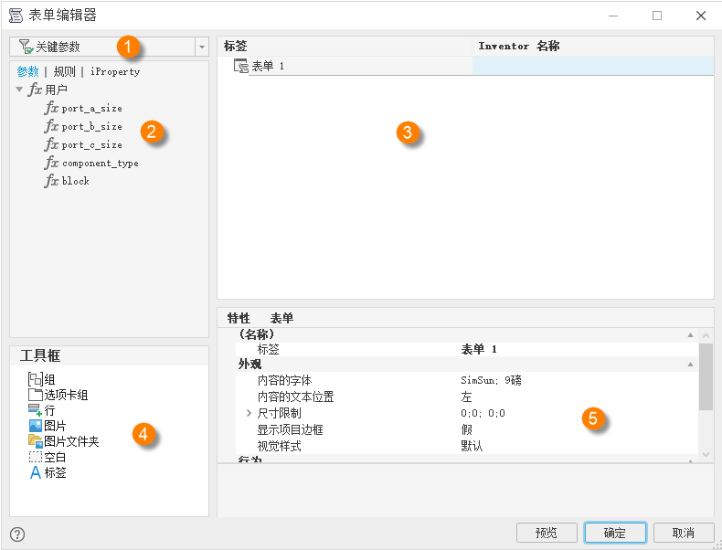将选项卡上的项目拖放到表单设计树中,可在用户界面设计上添加控件。选项卡上仅显示现有的参数和规则。