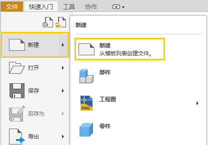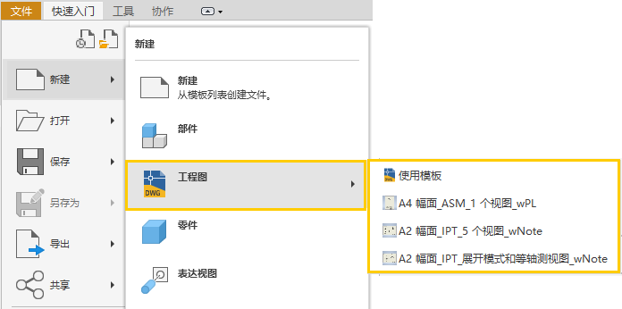 “来自文件” “新建” “工程图”:将光标悬停在弹出菜单箭头上以显示弹出菜单中可用的图纸格式模板,然后单击以进行选择。