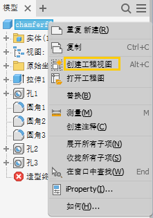 | 在零件或部件文件中(部件在 Inventor LT 中不可用):在浏览器中的文件名上单击鼠标右键,然后选择“创建工程视图”。将显示“新建文件”对话框。 | 若要打开 standard.idw(使用模板),请单击“创建”。也可以双击模板以将其打开。 |