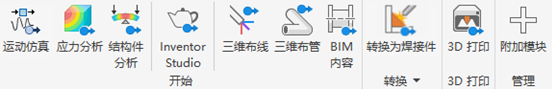 注: 运动仿真和应力分析在 Autodesk Simulation 产品和 Autodesk Inventor Professional 中均可用。三维布线和三维布管仅在 Autodesk Inventor Professional 中可用。