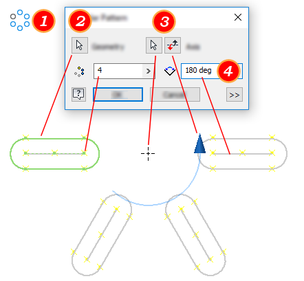 - 在“数量”字段中输入要创建的元素数,并在“角度”字段中输入第一个阵列元素与最后一个阵列元素之间的角度。