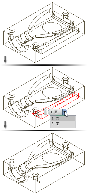 删除体块,如定义模型基础的结果。体块是一组可能包含或不包含中空体的面。零件或曲面体应至少具有一个体块。为模型形状造型、从基础中删除零件时,体块保留了下来。使用“删除面”从空腔中删除体块。