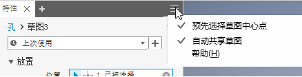 (“创建新孔”)时存在未使用的草图中心点,则将自动共享草图以在创建下一个孔时使用。如果不将草图用于下一个孔或单击“取消”或 Esc 键,将会取消共享该草图。可以在草图浏览器节点上单击鼠标右键,然后单击“共享草图”来手动共享草图。 仅在“零件”环境中可以自动共享草图。