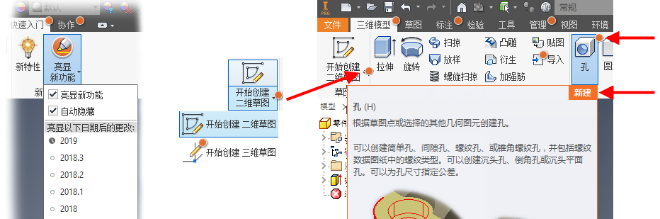 当启用“亮显新功能”时(默认情况下处于禁用状态)时,彩色的标记将亮显新命令或更新的命令。这使您可以更轻松地快速浏览您在工作流中使用的新命令或更新的命令。