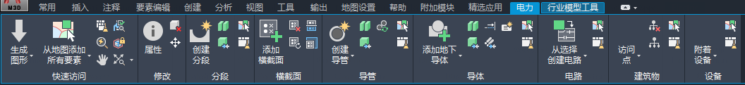 The Electric ribbon tab provides access to the most common operations in AutoCAD Map 3D toolset Electric. For example, you can create a segment using the Segment panel, add a Cross Section using the Cross Section panel, and then add ducts and conductors using the Duct and Conductor panels. Use the Circuit panel to define circuits by selecting the feature or by performing a trace. Use the Structure and Device panels to add structures and devices. The features you create using the Electric ribbon tab are displayed in the appropriate containers in the Electric Explorer. See Electric Explorer.