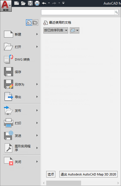 应用程序菜单包括搜索字段和与文件相关的命令。“选项”可显示 AutoCAD “选项”对话框,该对话框可控制诸如地图的背景色等。