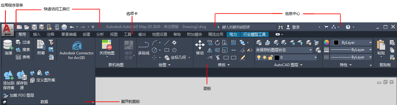在 AutoCAD Map 3D toolset 中,位于应用程序窗口顶部的一系列选项卡称为功能区。