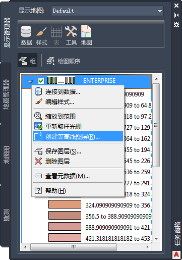 - 在“显示管理器”中的曲面图层上单击鼠标右键,然后单击“创建等高线图层”。