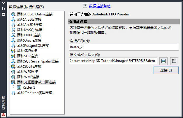 - 在“数据连接”窗口中的“通过提供程序进行数据连接”下,单击“添加光栅图像或曲面连接”,然后单击“源文件或文件夹”旁边的