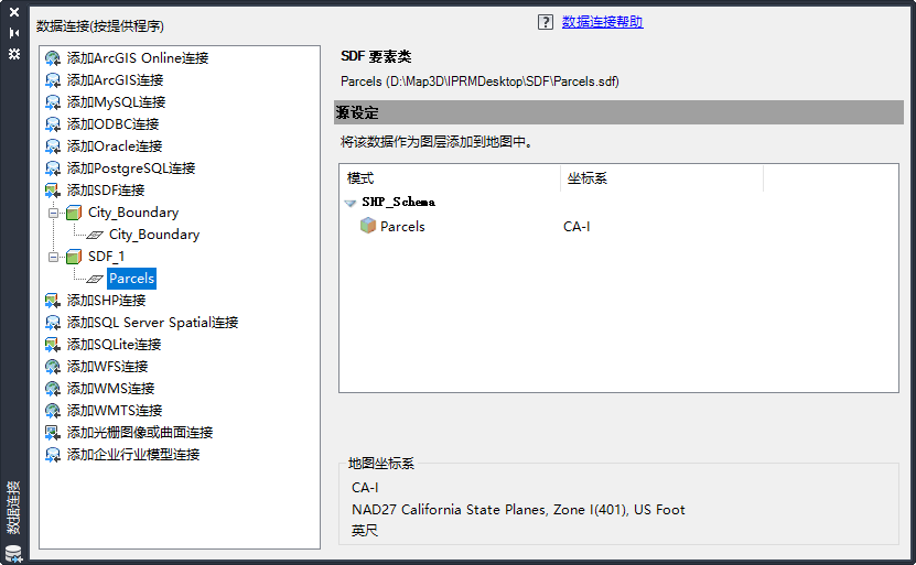 即使您未使用数据连接来附着非 DWG 数据源,数据连接也会显示有关所有附着的非 DWG 数据源的信息。例如,拖放到地图中的 SDF 文件将列于“数据连接”窗口中。