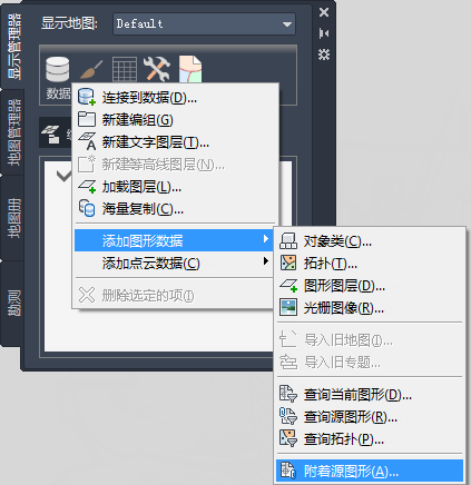 附着图形时,该图形不会在 显示管理器 中列出并且不显示在地图中。但是,它列在“当前图形”下的“任务窗格”的“地图管理器”选项卡中。