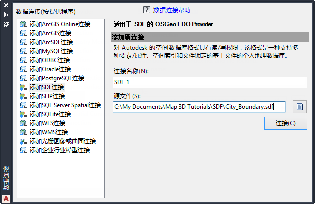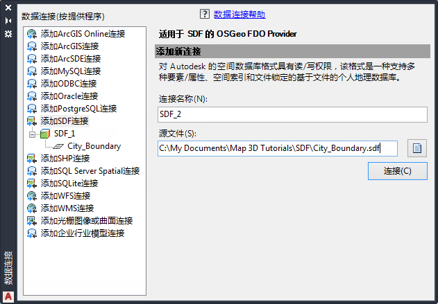 选择 SDF 提供程序并导航至样例文件 CITY_BOUNDARY.SDF。