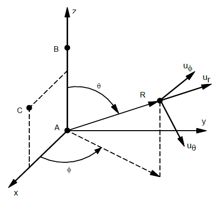 - The displacement coordinate directions at P are dependent on the location of P as shown above by (ur, uθ, uϕ).