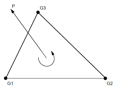 - In the case of a triangular surface, the assumed direction of the pressure is computed according to the right-hand rule using the sequence of grid points G1, G2, G3 illustrated in Figure 1. The total load on the surface is divided into three equal parts and applied to the grid points as concentrated loads. A minus sign in field 3 reverses the direction of the load.