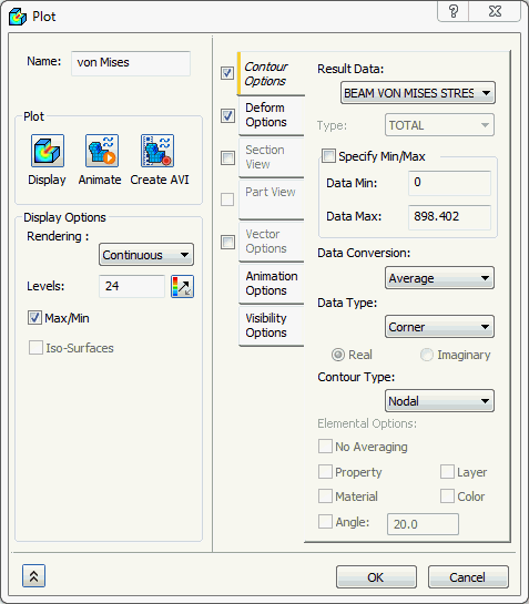 - 在“轮廓选项”选项卡中的“结果数据”下,选择“应力”;在“类型”下,选择“BEAM VON MISES STRESS”。