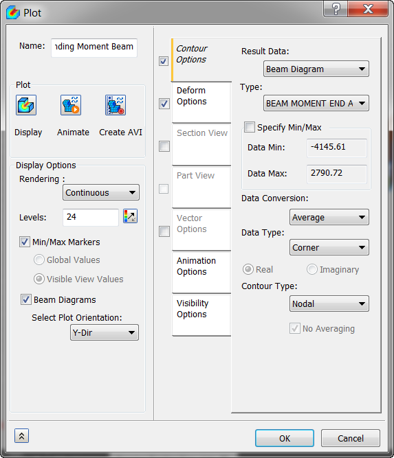 - 在“轮廓选项”选项卡中的“结果数据”下,选择“梁图”;在“类型”下,选择“BEAM MOMENT END A-Z PLANE 1”。