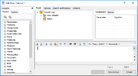 我们现在可以开始创建一个包含定义模型的 iLogic 命令的规则。我们可以创建多个规则,每个规则都具有独特步骤;还可以创建一个规则,其中包含用于构建模型所需的所有步骤。在本例中,我们将创建一个规则。