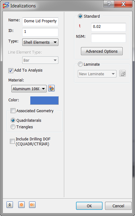 在此例中不需要关联的几何体。如果未定义关联的几何体,随后将为所有的壳单元定义此属性。当整个模型中有多个壳属性(即多个壳厚度)时使用此选项。