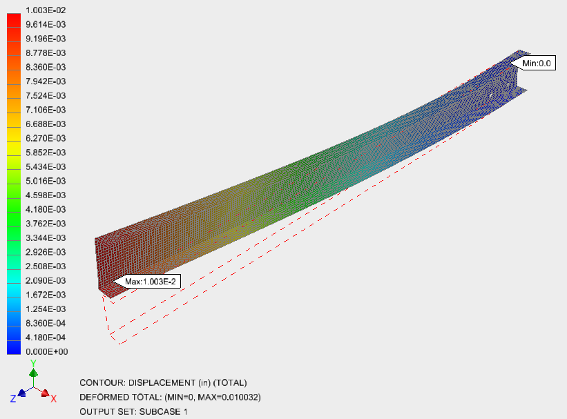载荷下查看梁的变形和轮廓图。为使图像清晰,载荷和约束已关闭。 可通过在