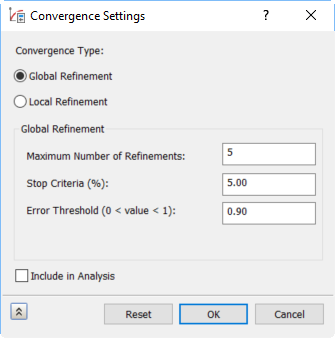 若要设置错误阈值,建议在阈值为 0.01 时运行第一次分析。在分析运行结束后,在“结果”面板上查看“收敛图”显示;如要进行下一次收敛运行,请将错误阈值设置为小于“收敛图”中显示的错误值。这样做应该会导致全局细化得到改进。