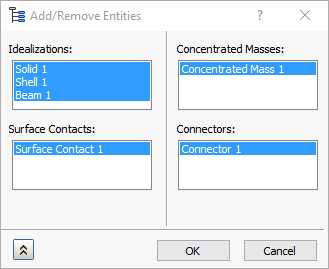 当在浏览器(Inventor Nastran 模型树)中的“分析”节点上单击鼠标右键并选择“添加/删除实体”时,将显示以下对话框: