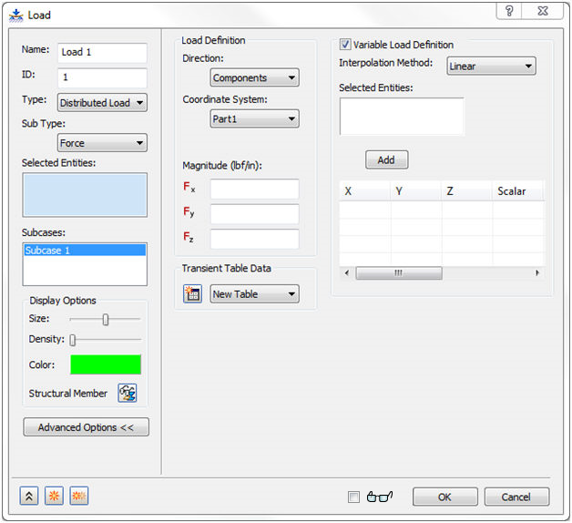 分布式载荷可以具有“子类型”,如“力”“力矩”。它具有相对于“全局”“单元”坐标的不同方向上的“幅值”选项。