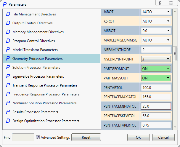 - 此时弹出“参数”表单。从左边窗口中选择“几何体处理器参数”,选中左下角的“高级设置”按钮,使用对应的下拉菜单继续将“PARTGEOMOUT”、“PARTMASSOUT”和 “ELEMGEOMOUT”设定为“打开”。