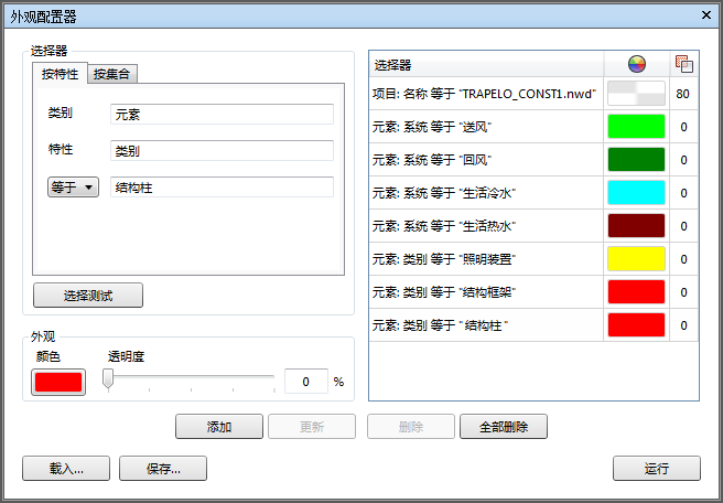 通过“外观配置器”可以基于集合(搜索集和选择集)及特性值设置自定义外观配置文件,然后使用这些配置文件对模型中的对象进行颜色编码,以区分系统类型并直观识别其状态。外观配置文件可以另存为 DAT 文件,并可以在 Autodesk Navisworks 用户之间共享。