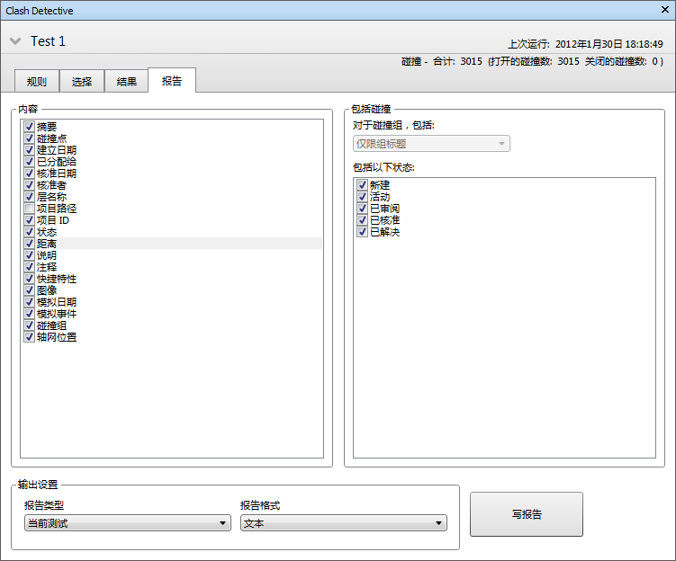区域中,选中希望在每个碰撞结果的报告中显示的数据的复选框。这可能包括与碰撞所涉及的项目相关的“快捷特性”