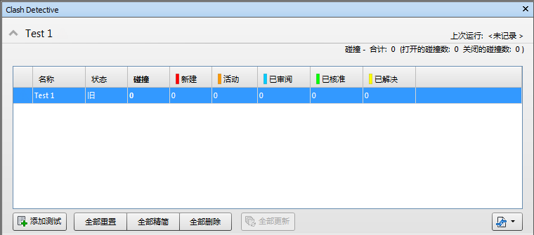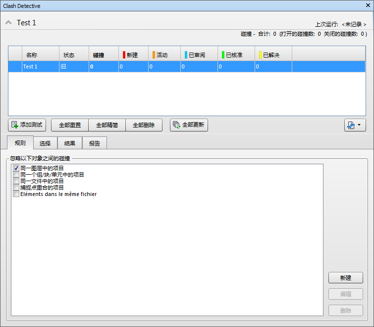 当前选定碰撞检测的摘要始终显示在“Clash Detective”窗口的顶部。其中显示检测中的碰撞总数,以及已打开(“新建”、“活动的”、“已审阅”)和已关闭(“已核准”、“已解决”)碰撞的详细信息。如果碰撞检测在经过设置后通过某种方式进行了更改(这可能包括更改选项,或者载入了最新版本的模型),这意味着结果可能不反映最新的模型或设置,则系统会显示警告