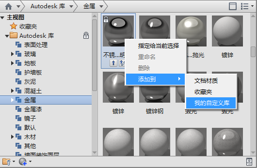 2. “材质”选项卡中,在材质样例上单击鼠标右键 单击“添加” 单击要将材质添加到其中的库的名称。如果没有自定义库,则需要首先创建自定义库。
