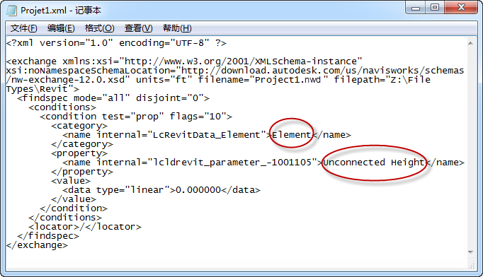请注意,在上图中,“查找项目”窗口(左侧)中的“元素”类别在“特性”窗口(右侧)中显示为“元素”选项卡,“未连接的高度”显示在每个窗口中的“特性”列中。然后,您可以在“查找项目”窗口中执行“导出”操作以生成 XML 文件,如下所示。请注意“元素”和“未连接的高度”的编码方式: