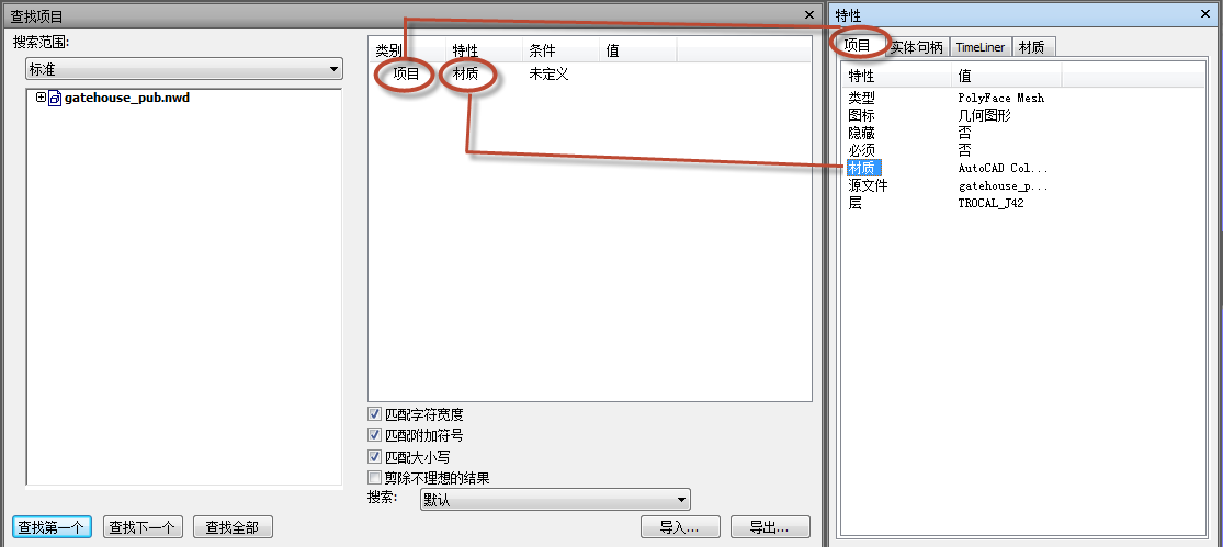 此过程的一个关键部分是:在“查找项目”窗口中查找具有特定模型特性的项目,将这些特性导出为一个 XML 文件,然后修改这些特性,使其映射到您选择的算量特性。它对于并排查看“查找项目”和“特性”窗口可能非常有用: