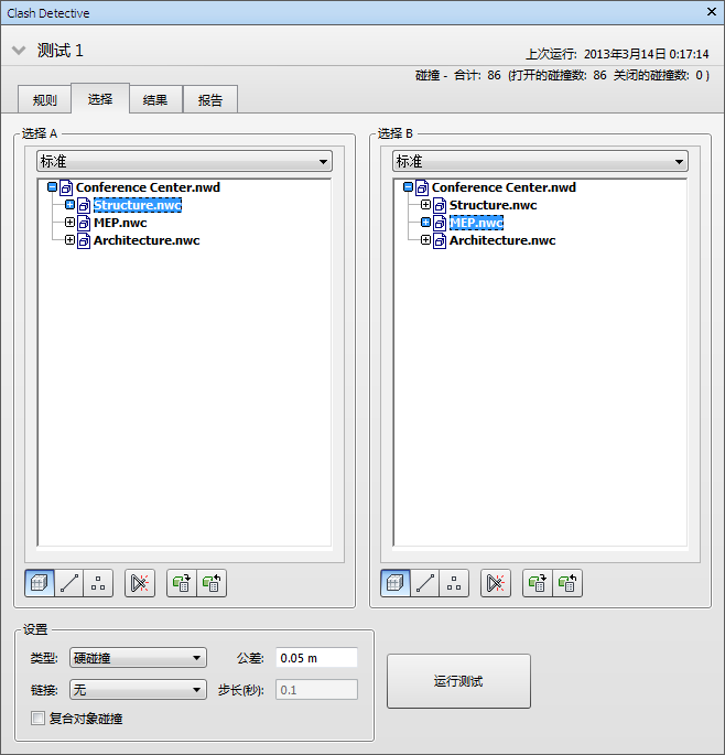 这两个窗格包含将在碰撞检测中以相互参照的方式进行测试的两个项目集的树视图。您需要在每个窗格中选择项目。