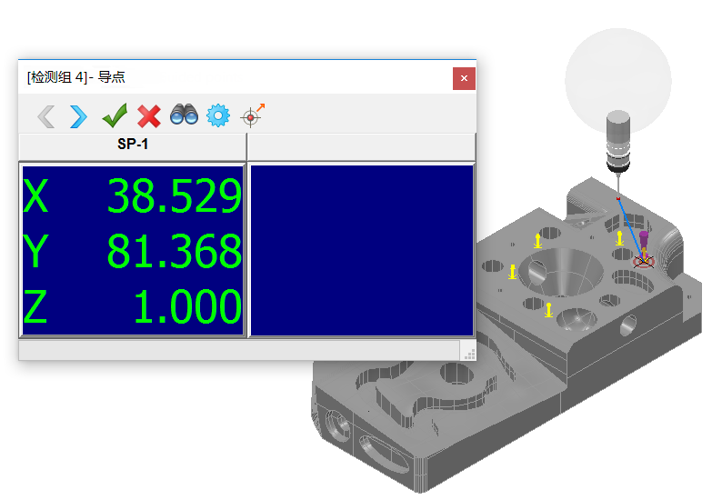 可移动到组中的上一个导点,并在对话框的左侧显示其详细信息。PowerInspect 会等待您探测点。