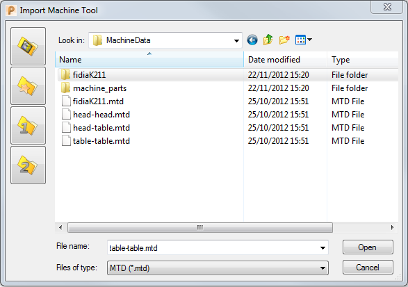 单击“机床”选项卡 >“文件”面板 >“输入”会显示现有的所有 MTD 文件: