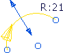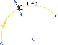 圆弧显示为黄色,每个端点都有一个蓝色手柄,并且用箭头来指示半径。