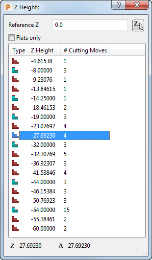 3. 单击“刀具路径”选项卡 >“显示”面板 >“按 Z 高度查看”以显示“Z 高度”对话框。“Z 高度”列表列出了刀具路径中可用的 Z 高度。