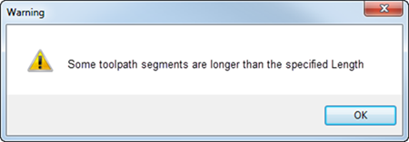 如果原始刀具路径中的一个或多个段比指定的长度长,则分割操作产生的某些刀具路径也将会超过该长度。在本例中,系统会显示警告消息:
