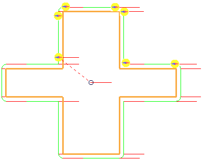 光顺距离 - 在指定距离上光顺刀具方向。在原始刀具路径的方向突然改变时(例如直角拐角),刀具的方向会快速改变,从而留下停留痕迹。为了防止出现这种情况,“光顺距离”会调和方向的变化,并显著改善表面光洁度。仅当“方向矢量”为“行程方向”时,此选项才可用。