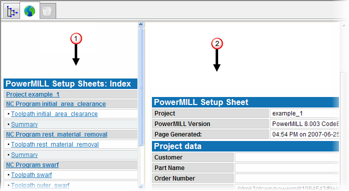 从“设置清单”关联菜单中选择“预览”选项后,PowerMill 会在项目文件夹中生成一些临时 HTML 文件,并会打开 PowerMill“浏览器”选项卡,在两个框架中显示创建的设置清单: