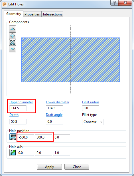 5. 在“编辑孔”对话框中,编辑所需域(在本例中,这些域包括“顶部直径”,以及 XY 坐标)。