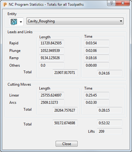 可以显示已选 NC 程序中所有切入切出、连接和切削移动的长度和时间值,以及提刀次数。