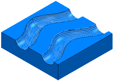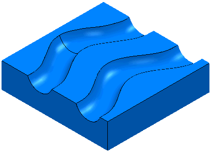 可以使用“曲线投影精加工”解决此问题。需要使用“参考线”来定义刀具路径的轨迹。在本例中,一条名为 Spine.dgk 的参考线(位于 Examples\Patterns 目录中)将会穿过通道的中心。