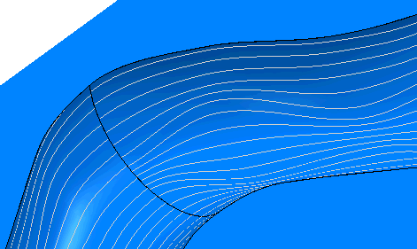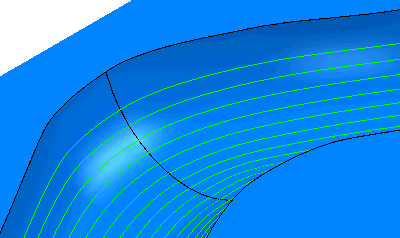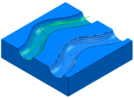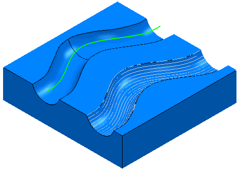 此策略与“直线投影精加工”策略类似,只不过参考线是曲线而非直线。在使用曲面投影精加工时,如果曲面定义不足以带来良好的结果,可以使用这种方法。