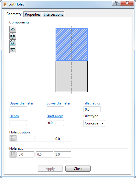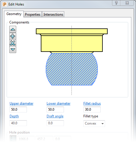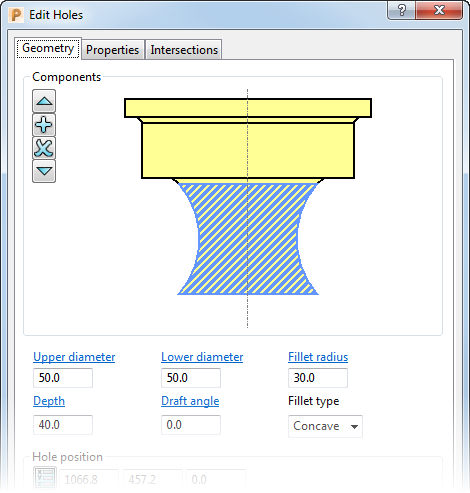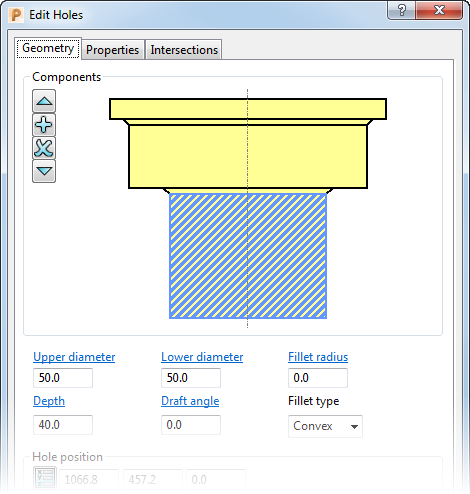 通过“编辑孔”对话框中的“几何形体”选项卡可编辑孔部件。
