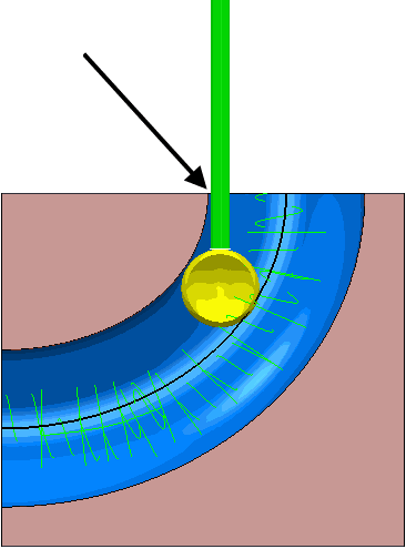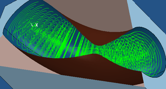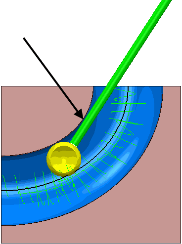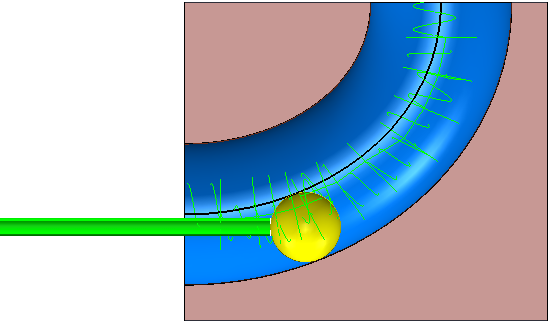 如果无法进一步创建刀具路径,但可以进入管道一侧,PowerMill 将从另一端进入管道,并尽可能应用与 3+2 轴策略相同的加工原理。