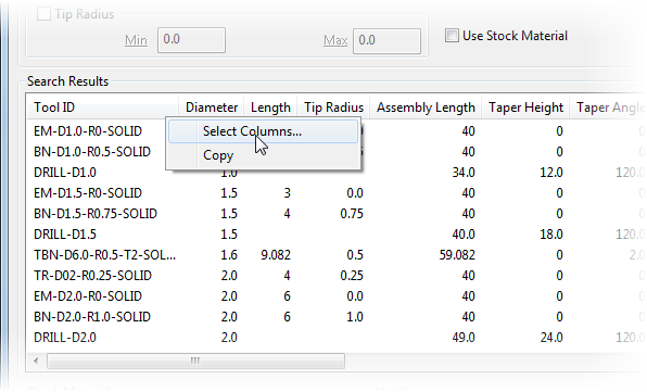 要复制“NC 程序”或“刀具数据库”对话框中的数据,请右键单击列标题,然后选择“复制”。