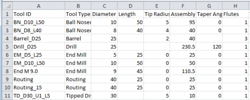 例如,从刀具数据库复制到电子表格的数据将如下所示: